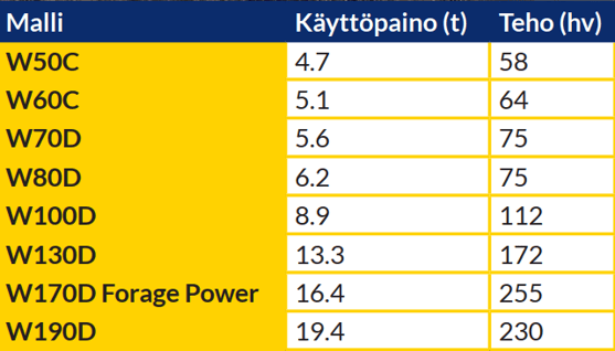 W70D ja W80D tarjoavat jo suurempaa tehoa (75 hv), ja noin 5,7–6 tonnin painoluokassaan ne palvelevat tehokkaasti esimerkiksi kuormaus-, siirto‑ ja talvikunnossapitotehtävissä.